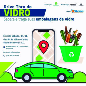 Tem vidro em casa para descartar? Dar o destino correto e responsável e ainda ajudar a gerar renda para diversas famílias. Este é o objetivo do “1º Drive Thru do Vidro”, uma iniciativa da Cooperativa Juntos Somos Fortes, em parceria com a Prefeitura, por meio da Secretaria do Meio Ambiente. A ação será neste sábado (24), das 8 às 13 horas, no Centro Social Urbano (CSU).