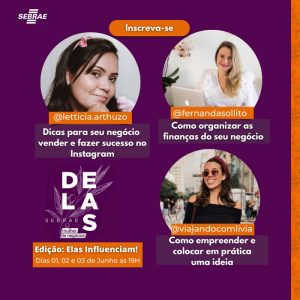 Com o objetivo de apoiar e fortalecer o empreendedorismo feminino na região, o Sebrae Piracicaba realiza entre os dias 01 e 03 de junho, às 19h, o evento online e gratuito “Sebrae Delas – Elas Influenciam”, que conta com o apoio do Sebrae Aqui e seus parceiros. As influenciadoras digitais Letícia Arthuzo, Fernanda Sollito e Lívia Pereira participarão da ação. Juntas, as três somam mais de 124 mil seguidores e seguidoras em seus perfis no Instagram. Mulheres que já empreendem ou que queiram empreender podem se inscrever pelo link http://bit.ly/SebraeDelasInfluenciadoras.