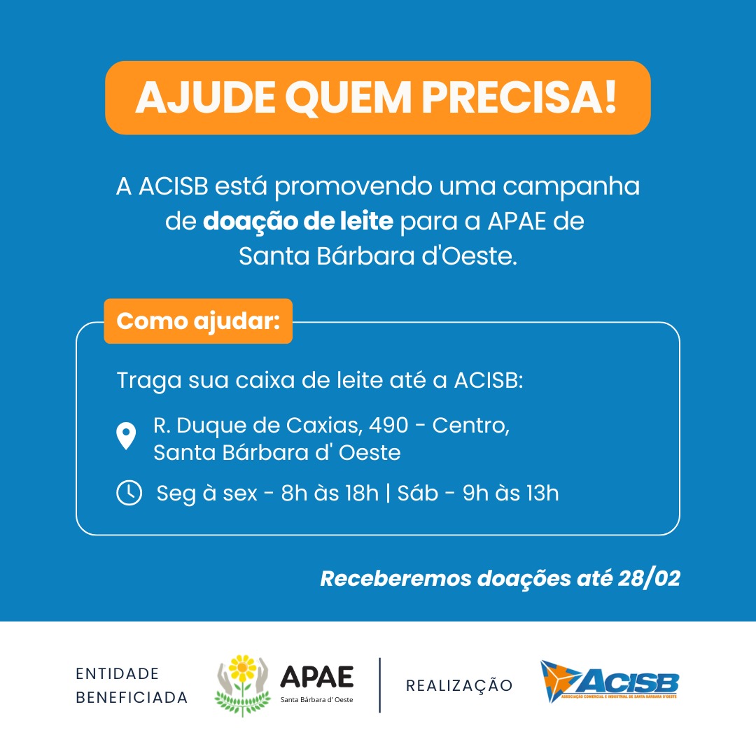 A ACISB (Associação Comercial e Industrial de Santa Bárbara d’Oeste) está promovendo uma campanha solidária de arrecadação de leite em prol da APAE (Associação de Pais e Amigos dos Excepcionais) do município. A ação tem como objetivo contribuir com a instituição, que possui quase 600 usuários, oferecendo serviços essenciais para a melhoria de sua qualidade de vida.