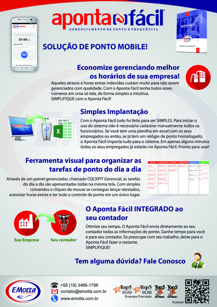 A parceria entre Acisb e EMotta permite que a EMotta ofereça aos associados da Acisb um sistema de ponto eletrônico em condições comerciais diferenciadas, integrado a sua folha de pagamento e agilizando o envio de informações do eSocial relativas a banco de horas. A parceria permite também que os usuários do sistema tenham ganho de tempo na marcação de ponto que pode ser feita através de um relógio eletrônico ou através do celular. A personalização de cálculos também é possível pois a EMotta é a desenvolvedora do software, portanto cálculos específicos também são implementados facilmente pela nossa equipe de desenvolvimento.