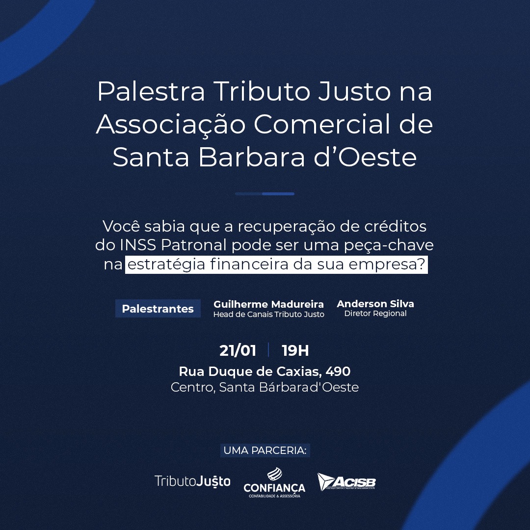 Você sabia que a recuperação de créditos do INSS Patronal pode ser uma peça-chave na estratégia financeira da sua empresa? Pensando nisso, a ACISB (Associação Comercial e Industrial de Santa Bárbara d’Oeste), em parceria com a Tributo Justo e a Confiança Contabilidade e Assessoria, realiza no dia 21 de janeiro, às 19h, palestra que visa orientar empresários sobre como reaver valores pagos a mais à União.
