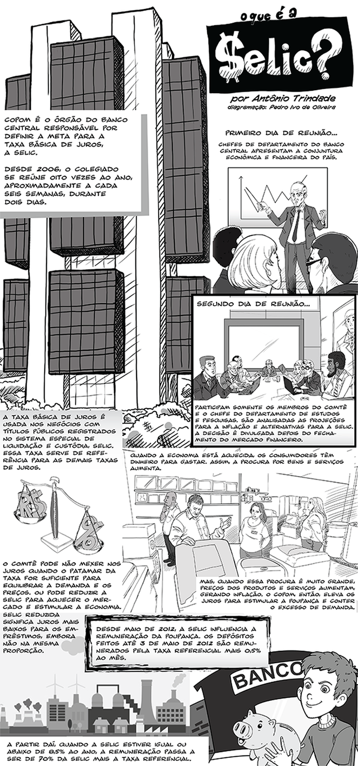A taxa básica de juros é usada nas negociações de títulos públicos no Sistema Especial de Liquidação e Custódia (Selic) e serve de referência para as demais taxas de juros da economia. Ao reajustá-la para cima, o Banco Central segura o excesso de demanda que pressiona os preços, porque juros mais altos encarecem o crédito e estimulam a poupança. Ao reduzir os juros básicos, o Copom barateia o crédito e incentiva a produção e o consumo, mas enfraquece o controle da inflação. Para cortar a Selic, a autoridade monetária precisa estar segura de que os preços estão sob controle e não correm risco de subir.