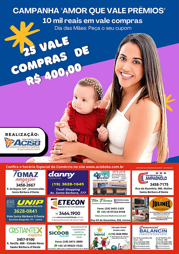 A Acisb (Associação Comercial e Industrial de Santa Bárbara d’Oeste), vai promover para os meses de abril, maio e junho, a primeira campanha promocional do ano, para movimentar as vendas do comércio de rua da área central e dos bairros. A ação vai distribuir R$16 mil reais em prêmios distribuídos para 40 consumidores de R$ 400,00 cada em vale-compras. O lançamento oficial acontecerá dia 09 de abril com a realização do Show na Praça com a presença do cantor José de Souza com muito sertanejo.