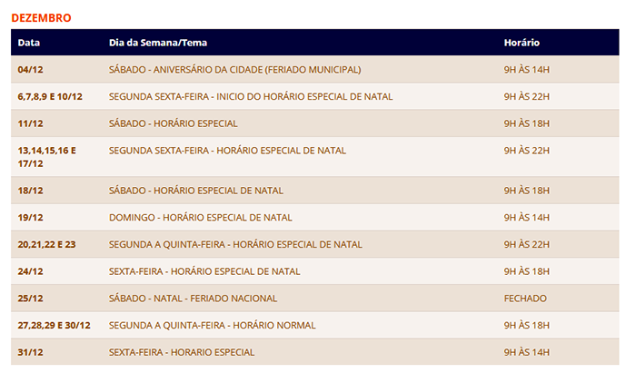Na véspera de Natal, dia 24 (sexta-feira), os estabelecimentos funcionam das 9h às 18h. Na véspera de Ano Novo, dia 31 (sexta-feira), as lojas abrem das 9h às 14h.