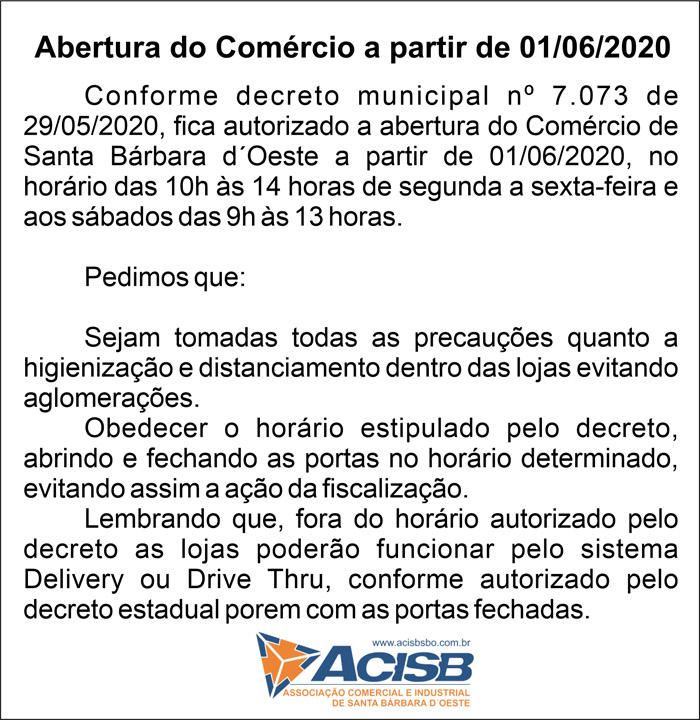 Para a retomada gradual de algumas atividades econômicas, a Acisb (Associação Comercial e Industrial de Santa Bárbara d´Oeste) e o Tivoli Shopping definiram seus horários de funcionamento para essa fase inicial.