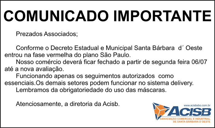 Home / Notícias / Comunicado Importante Comunicado Importante 04/07/2020 Por: acisb A Acisb informa seus associados e lojistas: Search Últimos Posts Associados da ACISB têm desconto especial na Imersão em Marketing e Vendas Empresário, temos uma condição especial para você patrocinar o Jantar dos Empresários Já está disponível segundo lote de convites para o Jantar dos Empresários 2025 ACISB é convidada a integrar Fórum Permanente de Inovação, Ciência e Tecnologia Sicoob Acicred promove palestra sobre Saúde Financeira na ACISB