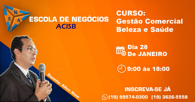 A Acisb (Associação Comercial e Industrial de Santa Bárbara d’ Oeste) promove nos próximos dias 28/01, através da Escola de Negócios Acisb, o curso Gestão Comercial Beleza e Saúde com o docente Ailton Alves.