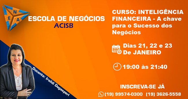 A Acisb (Associação Comercial e Industrial de Santa Bárbara d’ Oeste) promove nos próximos dias 21, 22 e 23/01, através da Escola de Negócios Acisb, o curso INTELIGÊNCIA FINANCEIRA – A chave para o Sucesso dos Negócios com a docente Iraildi Degasperi.