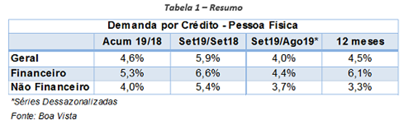 A Demanda por Crédito do Consumidor avançou 4% em setembro na comparação com agosto, já descontadas as influências sazonais, de acordo com dados nacionais da Boa Vista.