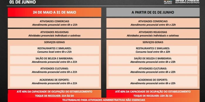 O toque de recolher continua nas 645 cidades do Estado, das 21h às 5h, assim como a recomendação de teletrabalho para atividades administrativas não essenciais e escalonamento de horários para entrada e saída de trabalhadores do comércio, serviços e indústrias. A partir do dia 1º, o toque de recolher será das 22h às 5h.