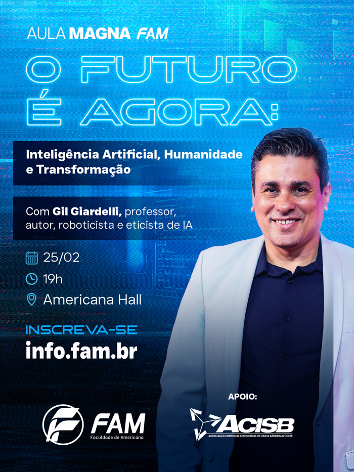 Com o tema “O Futuro é Agora: Inteligência Artificial, Humanidade e Transformação”, a Aula Magna contará com a palestra de Gil Giardelli, um dos principais pensadores brasileiros em inovação e Membro da AIFOD (ligada à ONU), promovendo desenvolvimento sustentável por meio da IA. A proposta é provocar reflexões sobre o impacto da inteligência artificial na sociedade, no trabalho e na formação humana, conectando conhecimento acadêmico às mudanças que já estão em curso no mundo contemporâneo.