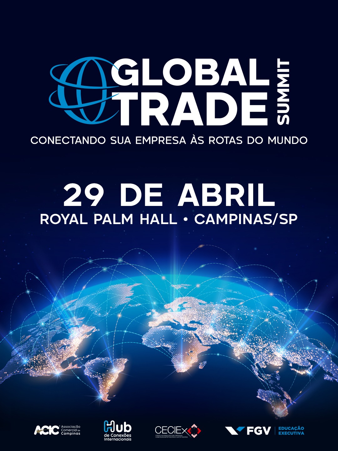 Campinas receberá, no dia 29 de abril, a edição 2026 do Global Trade Summit (GTS), encontro empresarial voltado à conexão de empresas da região com oportunidades no mercado internacional. O evento será realizado no Royal Palm Hall e deve reunir empresários, especialistas e instituições ligadas ao comércio exterior.