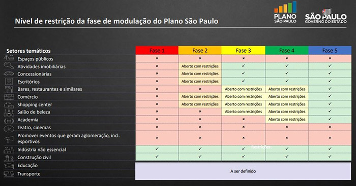 Por essa mesma sistemática, a fase quatro autoriza a abertura de academias de ginástica. E na quinta e última etapa, todos os setores, incluindo cinemas, teatro e eventos em geral, terão permissão para abrir.