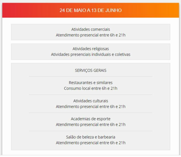 Fase atual, que permite o funcionamento de estabelecimentos até 21h, permanecerá em vigor até o dia 14 de junho. Na segunda-feira (24), estado ampliou capacidade máxima do comércio de 30% para 40%.