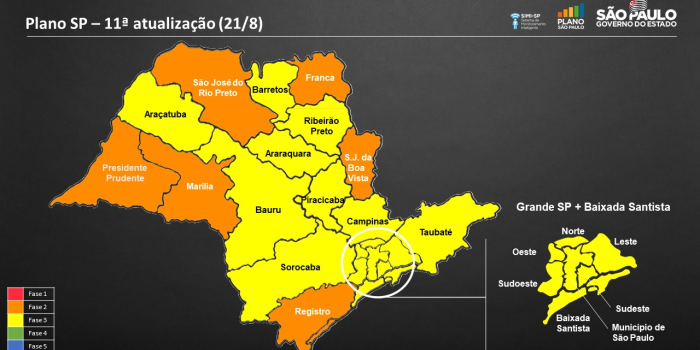 É a 11ª atualização programada do Plano São Paulo, em vigor desde o início de junho. Houve cinco progressões para fases de menor restrição à atividade econômica e mobilidade social. As áreas dos DRSs (Departamentos Regionais de Saúde) de Franca e Registro, que estavam na etapa vermelha, avançaram para a fase laranja. Já as sub-regiões Norte e Oeste da Grande São Paulo e a região do Barretos passaram da etapa laranja para a amarela. Confira o painel completo com os índices de evolução da pandemia e capacidade hospitalar nesta atualização do Plano São Paulo.