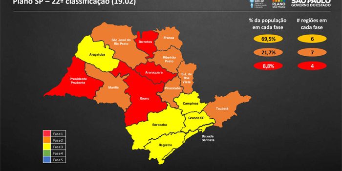 O Governador João Doria anunciou nesta sexta (19) a 22ª reclassificação de regiões no Plano São Paulo de controle da pandemia. A piora nos índices de avanço do coronavírus no interior deixa as áreas de Araraquara, Barretos, Bauru e Presidente Prudente na fase vermelha, com restrição total de comércios e serviços não essenciais. Houve melhora nas regiões de Franca, que avança para a etapa laranja, e Sorocaba, que progride para a fase amarela.