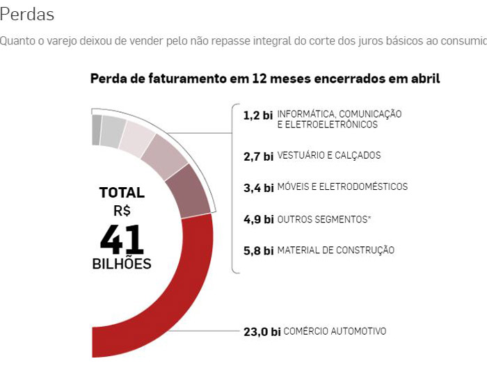 O comércio varejista poderia ter vendido R$ 41 bilhões a mais nos últimos 12 meses até abril deste ano e acelerado o consumo das famílias, o emprego e a renda, se o corte da taxa básica de juros tivesse sido repassado integralmente para o juros cobrados do consumidor, aponta um estudo da Confederação Nacional do Comércio (CNC).