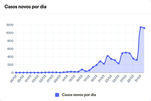 Os novos casos totalizaram 1.076. O resultado significou um aumento de 16% em relação ao total registrado antes. Mas, se considerados apenas os novos casos, o desempenho foi menor do que nos dois dias anteriores, quando os números foram, respectivamente, de 1.119 (em 1º de abril) e 1.138 (em 31 de março).
