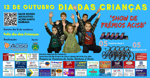 A Acisb (Associação Comercial e Industrial de Santa Bárbara d´Oeste), realizará entre os dias 15 de setembro de 2021 à 07 de janeiro de 2022 a Campanha “Show de Prêmios Acisb”, alusiva aos dias Da Criança 12 de outubro e Natal, 25 de dezembro. A promoção está quase pronta e vai premiar 21 consumidores que comprarem no comércio de Santa Bárbara d´Oeste nas lojas participantes da campanha neste periodo.