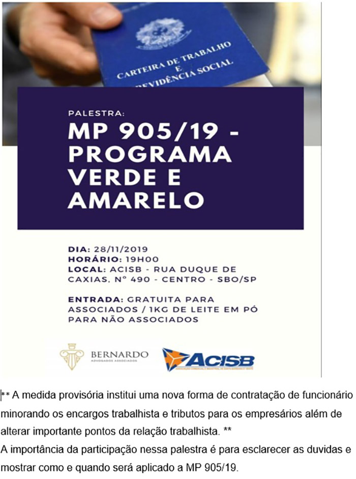 A Acisb estará realizando uma palestra gratuita para tirar dúvidas sobre o programa verde amarelo, a partir das 19 horas, na rua Duque de Caxias, 490, centro.