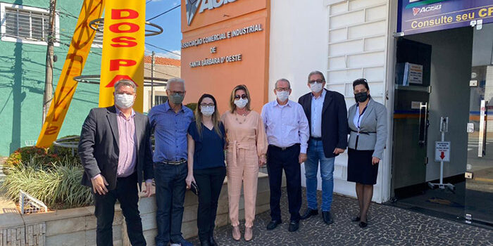 Foto 1 – JOSE Olival Moreira de Almeida Júnior – Assessor da Superintendência Geral da Facesp, João Batista de Paula Rodrigues presidente da Acisb, Ana Claudia Badra Cotait – Presidente do CMEC da FACESP E da ACSP, Rafael Piovezan prefeito de Sta. Bárbara d´Oeste, Talitha Delmondes diretora da Acisb, Roberto Bonamin diretor da Acisb.