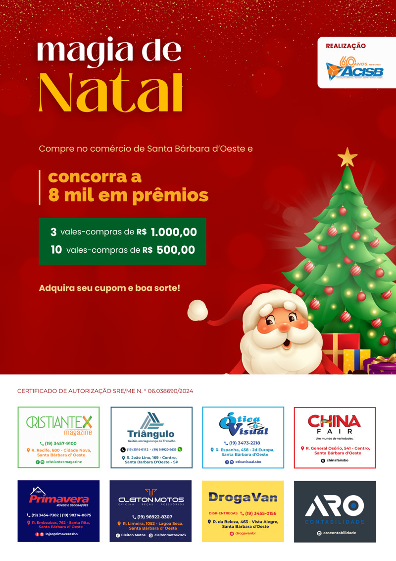 A Campanha Magia de Natal, realizada pela ACISB (Associação Comercial e Industrial de Santa Bárbara d’Oeste), está chegando ao final. Os consumidores têm até o fim da próxima semana para comprar nas lojas participantes da promoção e concorrerem a 13 vales-compras, que somam R$ 8 mil em prêmios. O sorteio será realizado no sábado (18/1), às 10h, na sede da entidade.