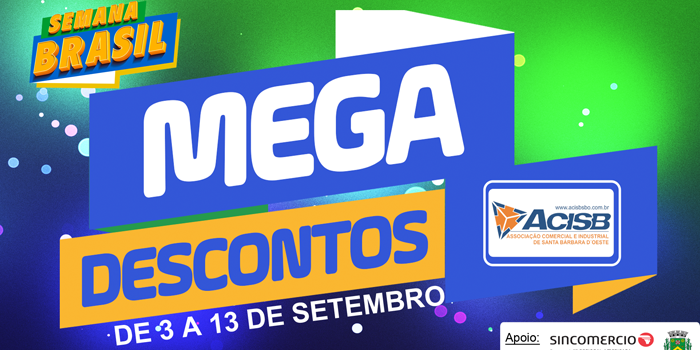 A Semana Brasil apoiado pela Acisb (Associação Comercial e Industrial de Santa Bárbara d´Oeste), vai até o próximo domingo dia 13 de setembro. As ações de estímulo ao consumo no comércio local têm mega descontos especiais para os consumidores aproveitarem em todas as lojas identificadas com o cartaz da campanha. A campanha aproveita o mote da semana da pátria, em alusão ao feriado da independência comemorado nesta segunda-feira (7/9).