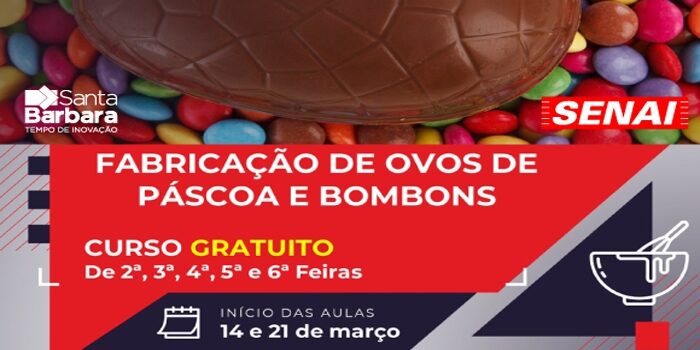 O SENAI “Alvares Romi” está com inscrições abertas para o curso gratuito de fabricação de ovos de páscoa e bombons. A oportunidade de qualificação pode gerar renda com a proximidade da Páscoa. São duas turmas, de 14 a 22 de março e de 21 a 29 de março, com duas opções de locais, no CRAS (Centro de Referência e Assistência Social) IV, no Conjunto Roberto Romano e Emefei “Antonia Fagnoli Furlan”, no 31 de Março. O curso tem sete dias de duração e acontece de segunda a sexta-feira. As vagas são limitadas e preenchidas por ordem de registro de interesse.