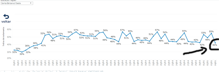 Na semana passada, entre segunda (27) e quinta-feira (30), Santa Bárbara registrou índices que variaram de 42% a 44%. Na sexta-feira, Dia do Trabalho, a taxa subiu 53%.