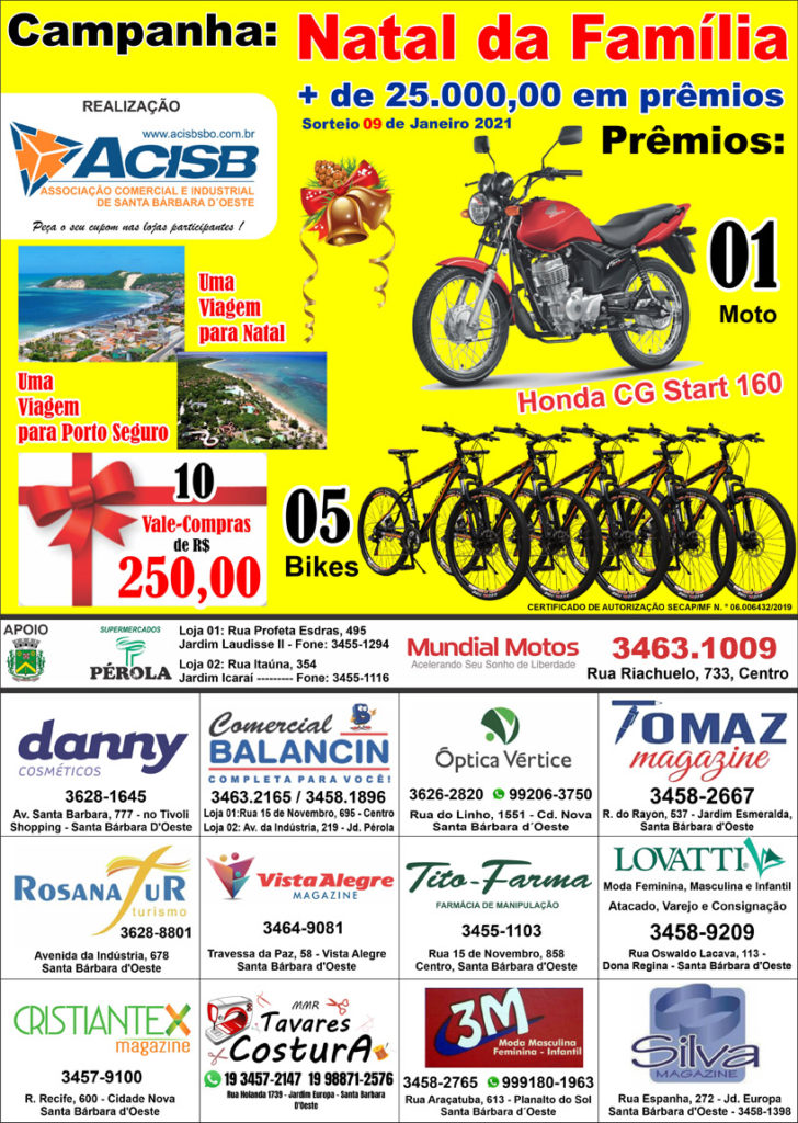 A partir de segunda-feira, dia 9, com o CERTIFICADO DE AUTORIZAÇÃO SECAP/ME N. ° 06.010198/2020, vai começar a campanha “Natal da Família” da Acisb, serão mais de 25 mil reais em prêmios e a adesão é mínima para você. Venha fazer parte do maior evento do ano para o nosso comércio que é o Natal. Informações e adesões 3499-1244 com a Solange.