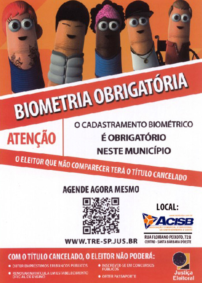 Santa Bárbara d’Oeste está entre as cidades que terão eleição com biometria em 2020. O prazo para a revisão do título de eleitor no município começou em fevereiro e termina em 19 de dezembro. Para fazer a biometria, os eleitores devem levar documento oficial de identificação, comprovante de residência recente e título de eleitor, se tiver. Quem não comparecer até o prazo final terá o título cancelado, sem o qual o eleitor fica impedido votar, tirar CPF e passaporte, realizar empréstimo em bancos oficiais e participar de concurso público.